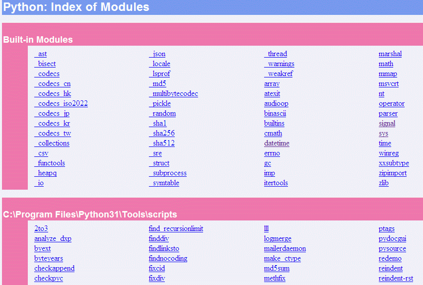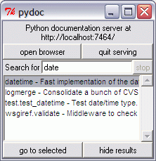 A Module Docs többé-kevésbé részletes leírással szolgál a gépünkön található modulokról, könyvtáranként csoportosítva. Webszerverként működik, amit a tűzfalunk szóvá is tehet. Adjuk meg az engedélyt, nem harap. Indításkor a felső két gombot látjuk, az alsó kettő pedig a keresőkifejezés beírásakor jelenik meg. Az open browser gomb hatására a dokumentáció kezdőlapja, a go to selectedre pedig a kiválasztott találat oldala nyílik meg a böngészőnkben. A quit serving bezárja a programot, de a már megnyitott weblapok megmaradnak.