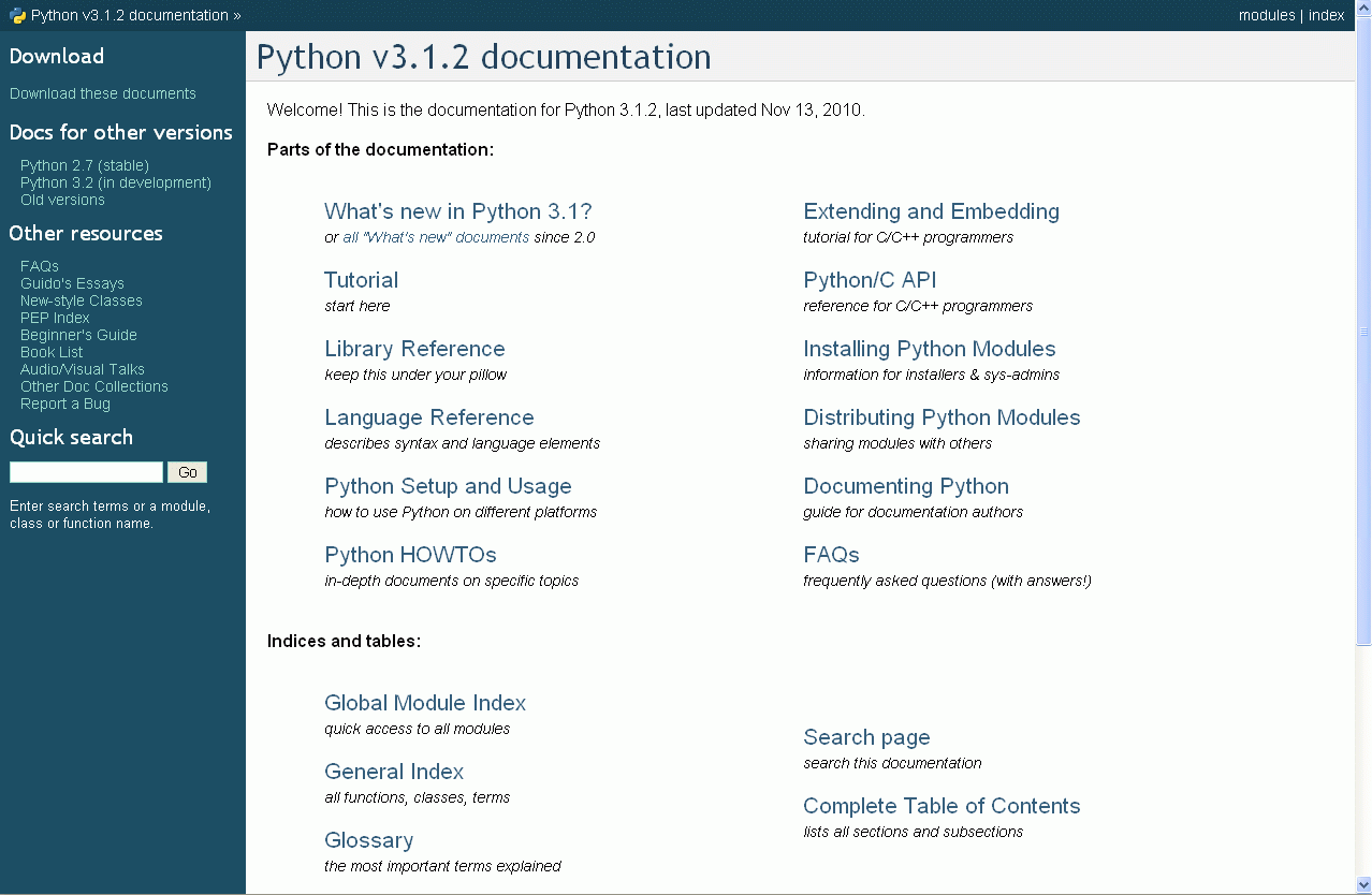 A http://python.org/ lapon a dokumentációra kattintva a http://python.org/doc/ oldalra jutunk (a hasonló cím ellenére ez nem ugyanaz, mint a docs.python.org). Itt különösen a Beginner's Guide és a wiki lehet érdekes. A bal alsó sarokban megtaláljuk a készülő verziók menetrendjét is. Kellemes böngészést!